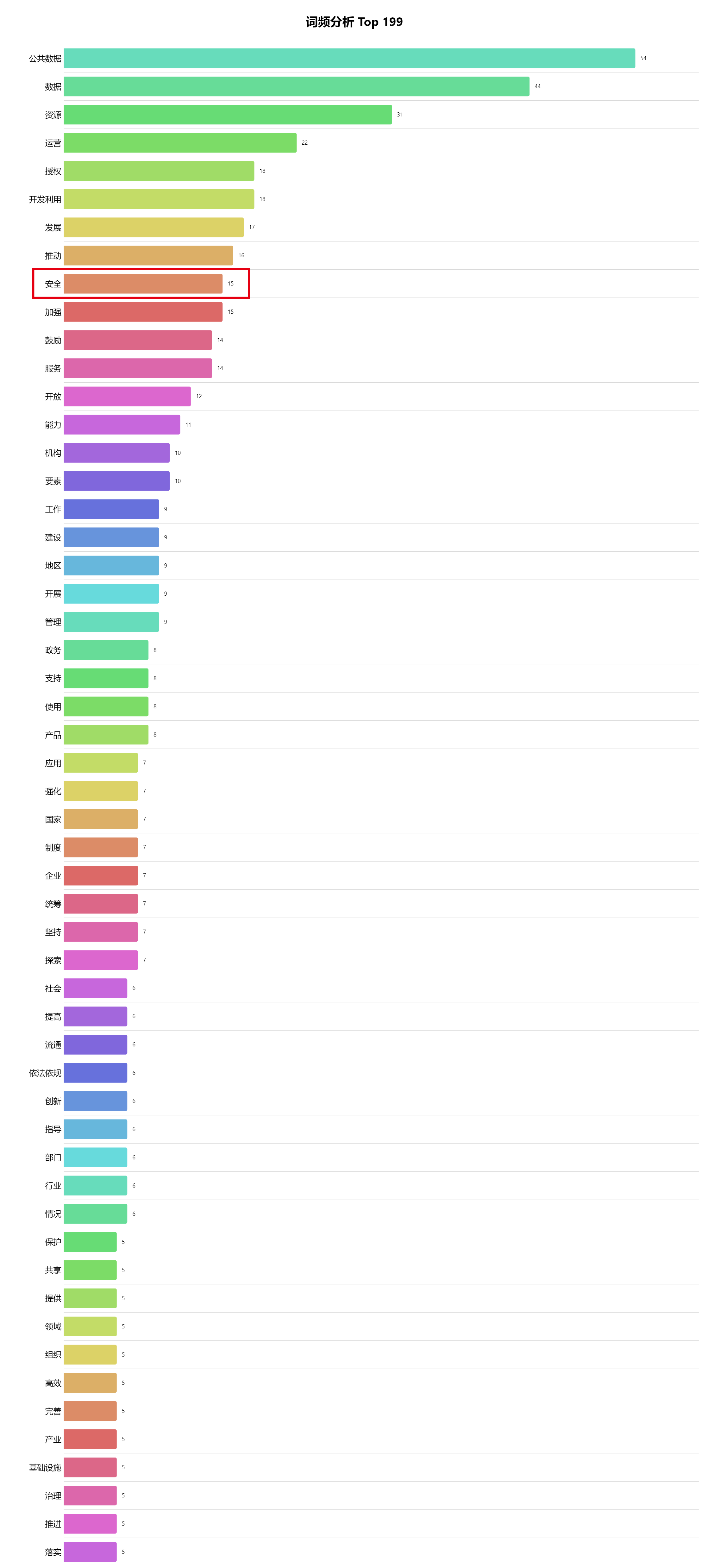 我们根据各词在原文中的权重进行计算和排序,绘制出热词云图如下。从图中可以清楚的展示公共数据、数据、资源、安全、数据安全等词项,占据了最大的面积,从而在该文中具有最大的重要性。